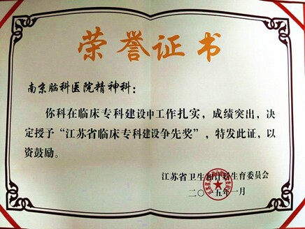 2015年1月,江苏省卫生和计划生育委员会授予我院精神科“江苏省临床专科建设争先奖”(苏卫医政〔2015〕3号)。并希望获奖单位和专科再接再厉,巩固和发展专科建设成果,为推动我省的临床专科能力建设,引领卫生计生事业发展发挥更加积极的作用。全省各级医疗卫生机构和各临床学科、专科,要以获奖单位和专科为榜样,树立强烈的“争先进位”意识,在临床专科建设上下大工夫,加强人才培养,加强能力建设,努力为全省人民提供更高水平的临床诊疗服务。
